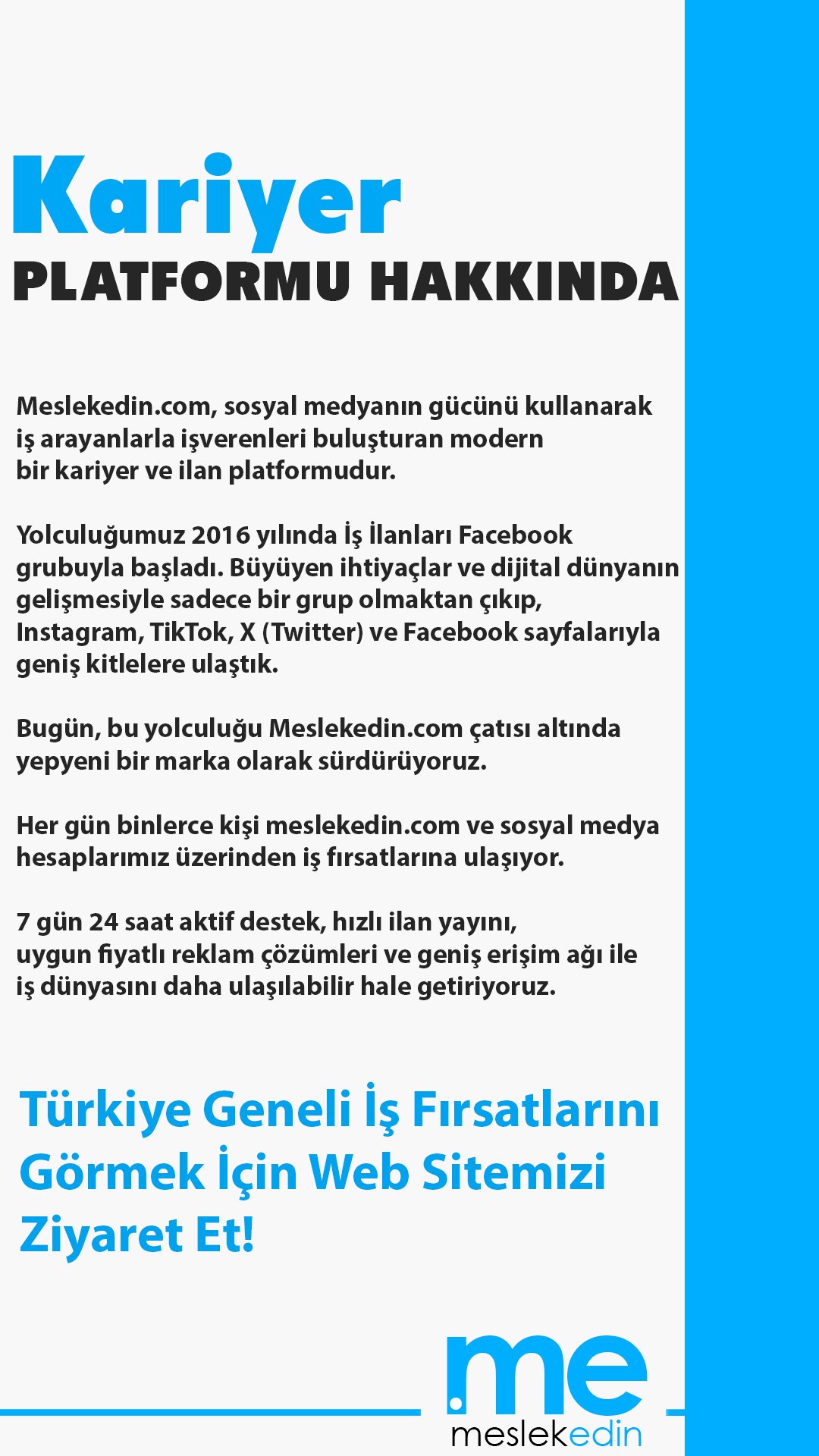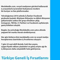 İş arayanların ve işverenlerin ihtiyaçları zamanla değişti. Artık insanlar sadece klasik kariyer sitelerine bağlı kalmadan, sosyal medya üzerinden de iş fırsatlarını takip ediyor. Biz de bu ihtiyaca yanıt vererek ilanlarımızı sadece meslekedin.com üzerinden değil; aynı zamanda Facebook, Instagram, Twitter (X), TikTok ve WhatsApp hesaplarımızda da paylaşıyoruz.