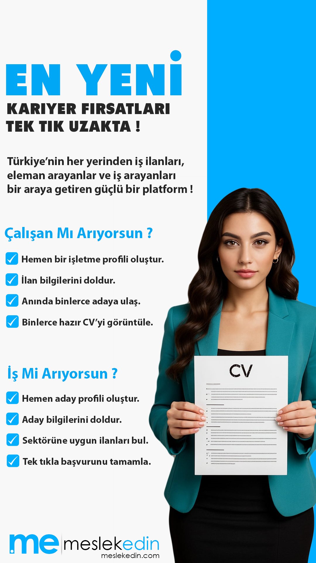 Meslekedin, yalnızca iş ilanı yayınlayan bir platform değil; aynı zamanda maaş rehberleri, kamu duyuruları, mesleki içerikler ve kariyer ipuçları ile kullanıcılarına yol gösteren bir kariyer merkezidir.